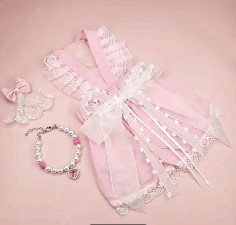 Conjunto de vestido color rosa c/puntilla ,moño y collar. Talle XL