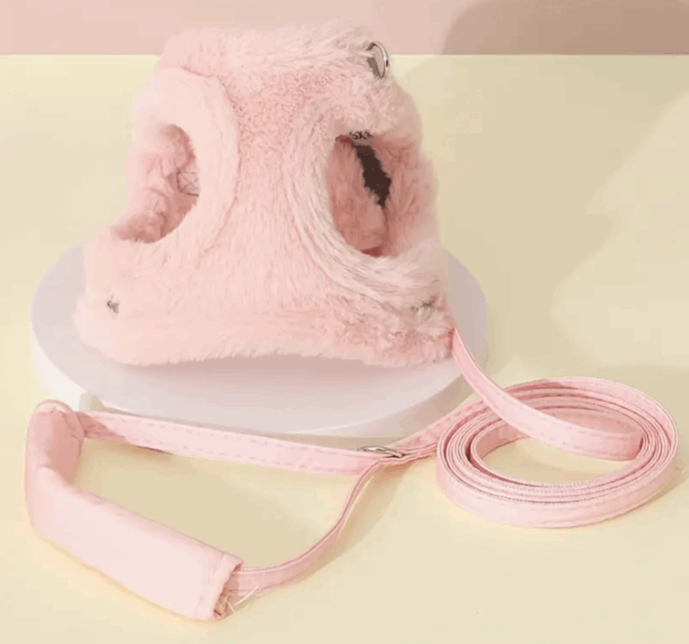 Arnes rosa de plush ajustable.Trae correa. Talle L y XL