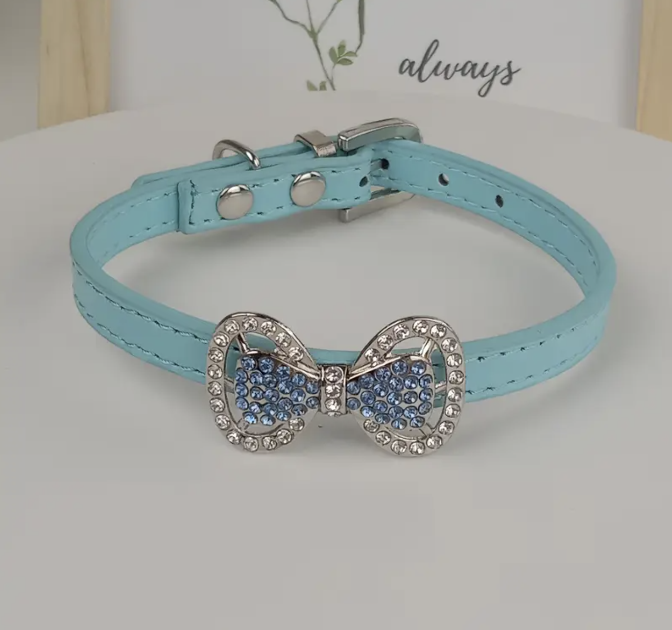 Collar celeste de cuero ecologico c/moño de strass. Talle XS