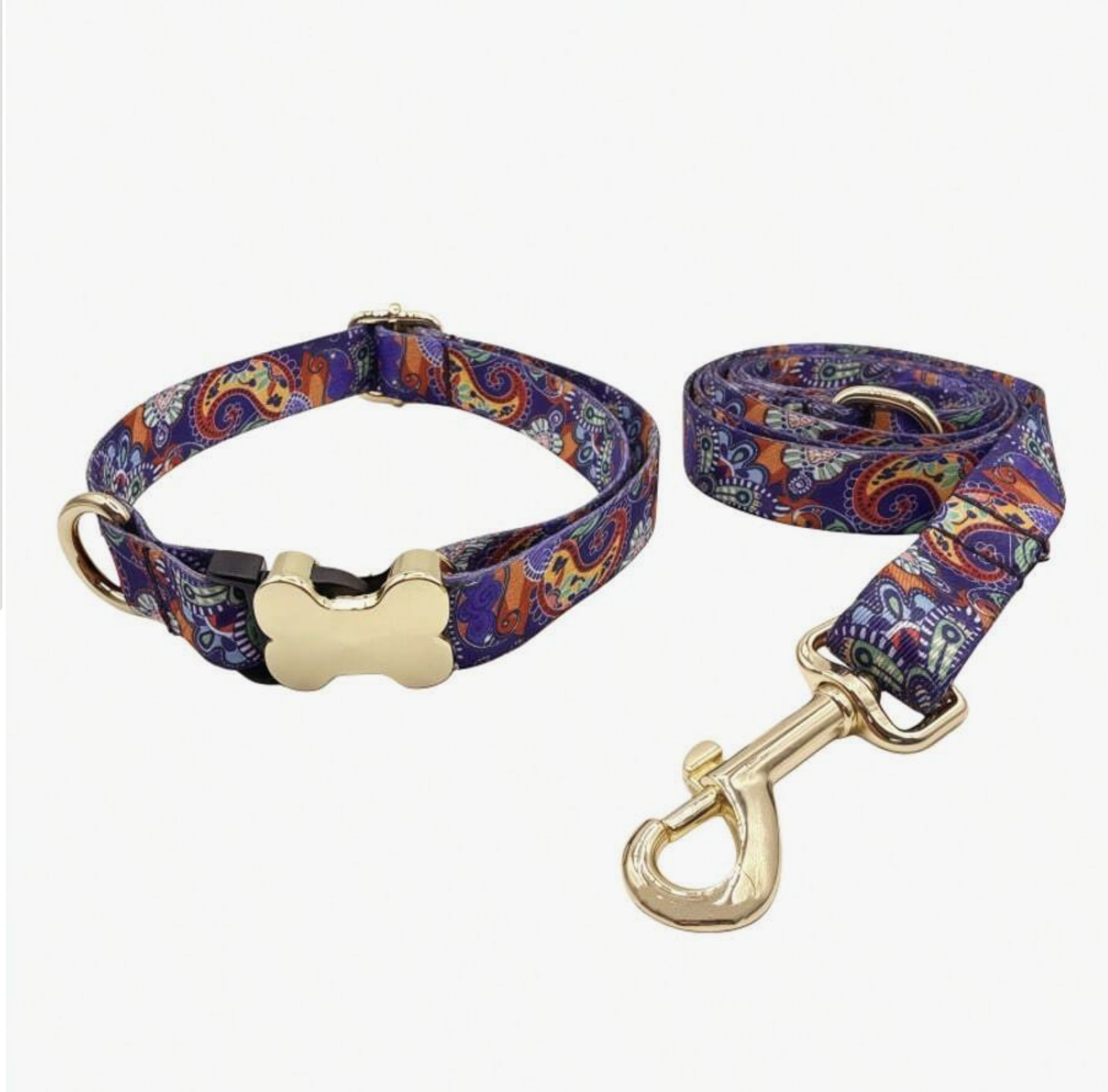 Set collar y correa estampado lavanda c/hebilla dorada de huesito.Ajustable.Talle L