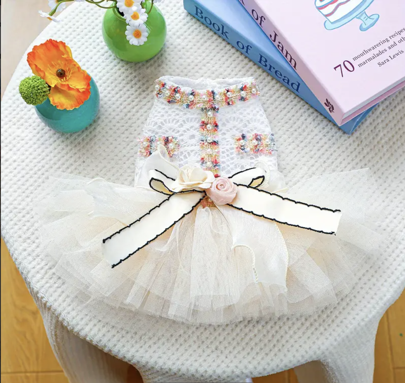 Vestido c/detalle de perlas y flores. Pollera con tutu.Talle L